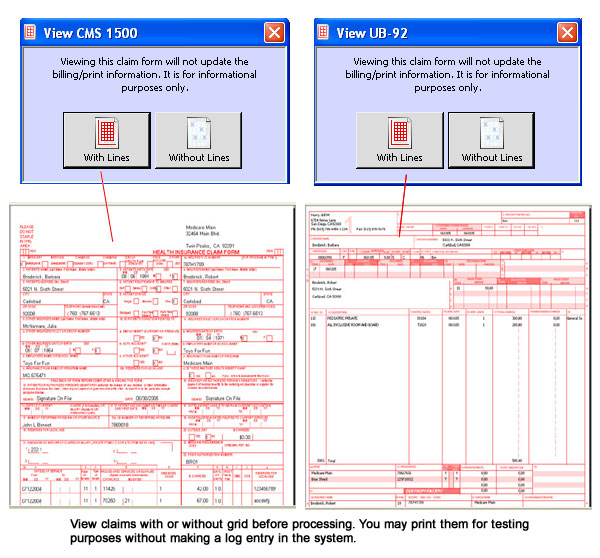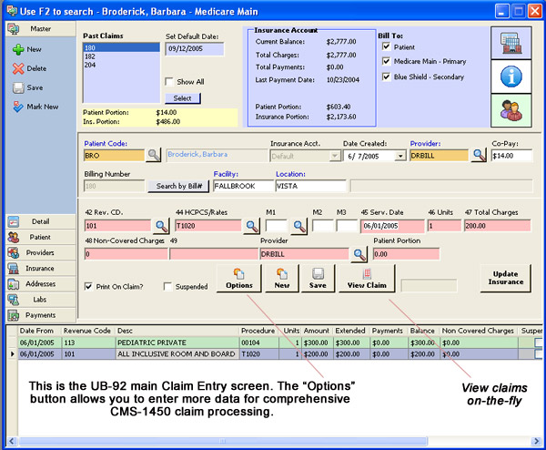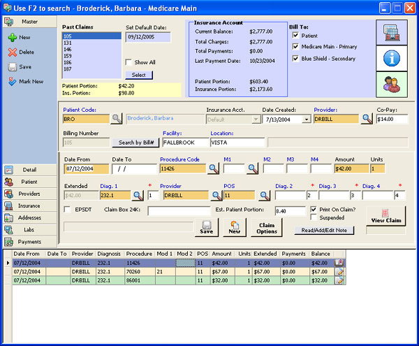 The main window is feature-rich. You can enter new claims, view a patient’s claims history or insurance balance, research prior claims, and see the detail of every transaction on a claim at the bottom of the screen.